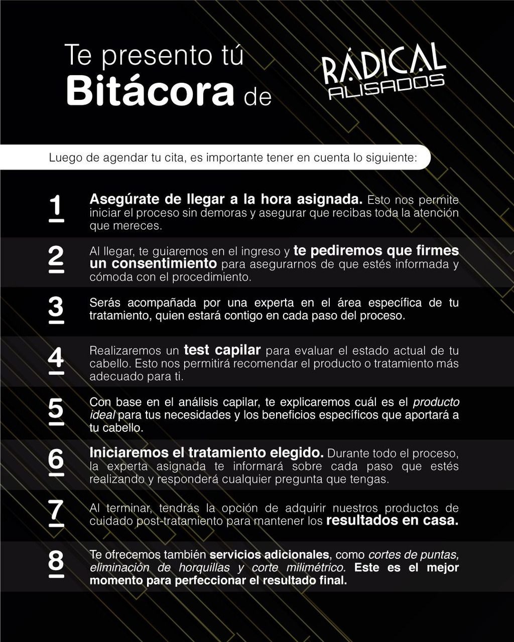 II. En RADICAL ALISADOS está establecido que una vez se realice el primer servicio, dependiendo de las características del cabello de nuestro cliente, se realiza una segunda sesión y si el caso capilar (producto no compatible con el tipo de cabello) persiste, se le indica al cliente que debe esperar por lo menos 3 meses para evitar contacto con productos químicos y la tercera sesión se asume por parte de la empresa.