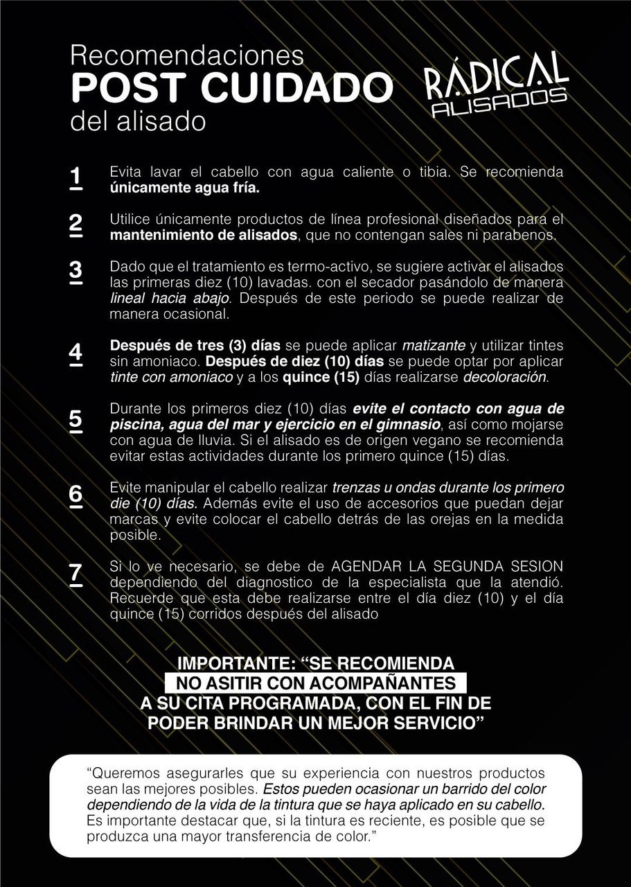 II. RADICAL ALISADOS, no puede asegurar un resultado permanente por un tiempo prolongado, si no se tiene conocimiento de los cuidados después de la prestación del servicio.
